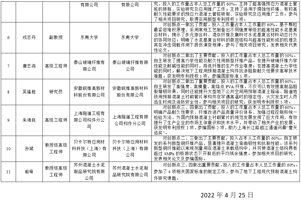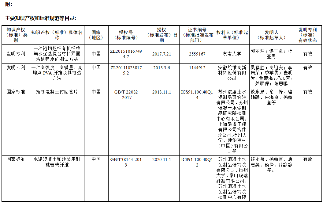 主要完成單位: 東南大學,揚州大學,蘇州混凝土水泥制品研究院有限公司,蘇州混凝土水泥制品研究院檢測中心有限公司,建華建材(中國)有限公司,安徽皖維高新材料股份有限公司,泰山玻璃纖維有限公司,上海隧道工程有限公司構件分公司,貝卡爾特應用材料科技(上海)有限公司